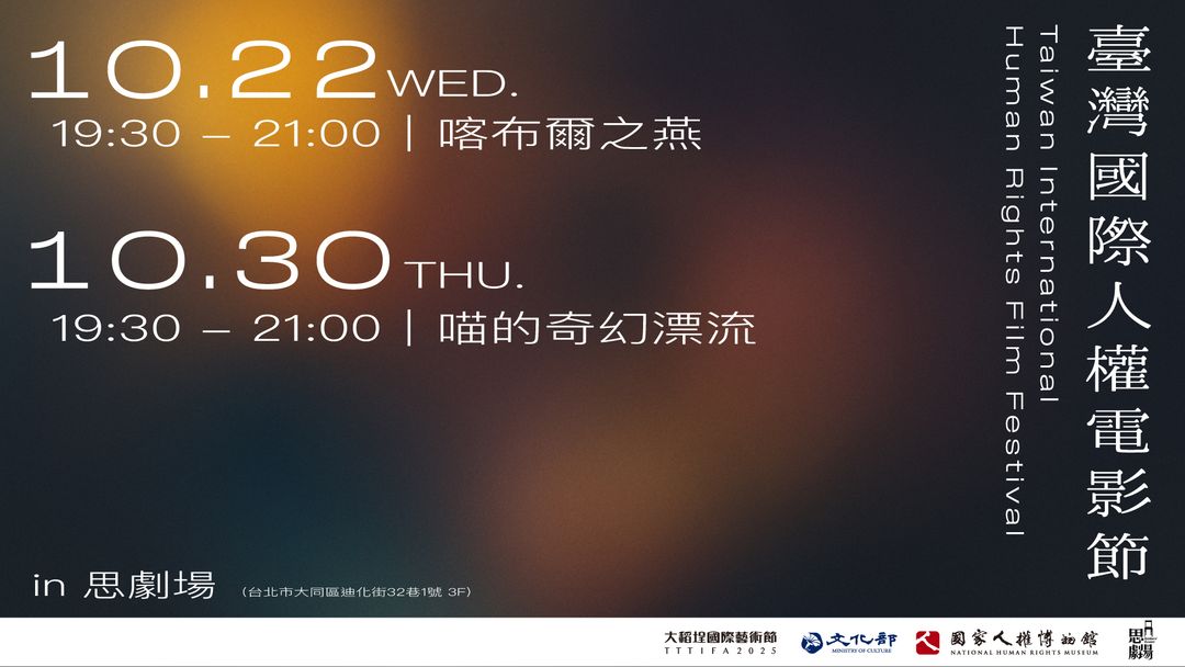 國家人權博物館每年度舉辦「臺灣國際人權影展」,精選國內外與人權議題,帶動討論。今年藝術節特別響應 臺灣國際人權電影節,於「思劇場 Thinkers’ Theater」放映兩部國內外精選影片,帶你透過影像凝視人權,感受最真切的力量。